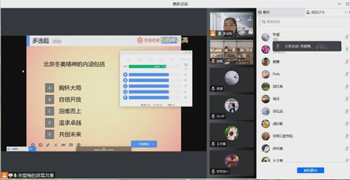 宋爱梅使用了雨课堂的“弹幕”、“随堂测试”和“投票”等功能,为支部党员同志们宣讲了“胸怀大局、自信开放、迎难而上、追求卓越、共创未来”的北京冬奥精神,号召支部全体党员凝聚共识、汇聚智慧和力量,坚决把思想和行动统一到党中央决策部署上来。宋爱梅还介绍了支部党员吴寅龙、严媛媛、杨媚等同志毫无怨言、积极参与济南市全员核酸检测采样工作的先进事迹。同时,结合王文霞、段小琪同志认真准备开展线上教学的事例,阐述了如何用“生命至上、举国同心、舍生忘死、尊重科学、命运与共”的伟大抗疫精神指导我们普通党员的日常工作。在授课过程中,党员们纷纷通过弹幕功能参与互动,并通过参与随堂测试,检验本次党课的学习成果。