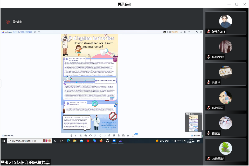 7月7日,BV伟德官方网站(口腔医院)首届全英文口腔科普壁报展示大赛通过线上方式成功举办。学院(医院)副经理郭杰等领导班子成员出席活动,活动邀请同济大学公司党委副书记孙瑶教授,伟德体育官网基础医学院副经理邹永新教授,BV伟德官方网站(口腔医院)副研究员、种植科医师杜密担任比赛评委。活动由郭杰主持。