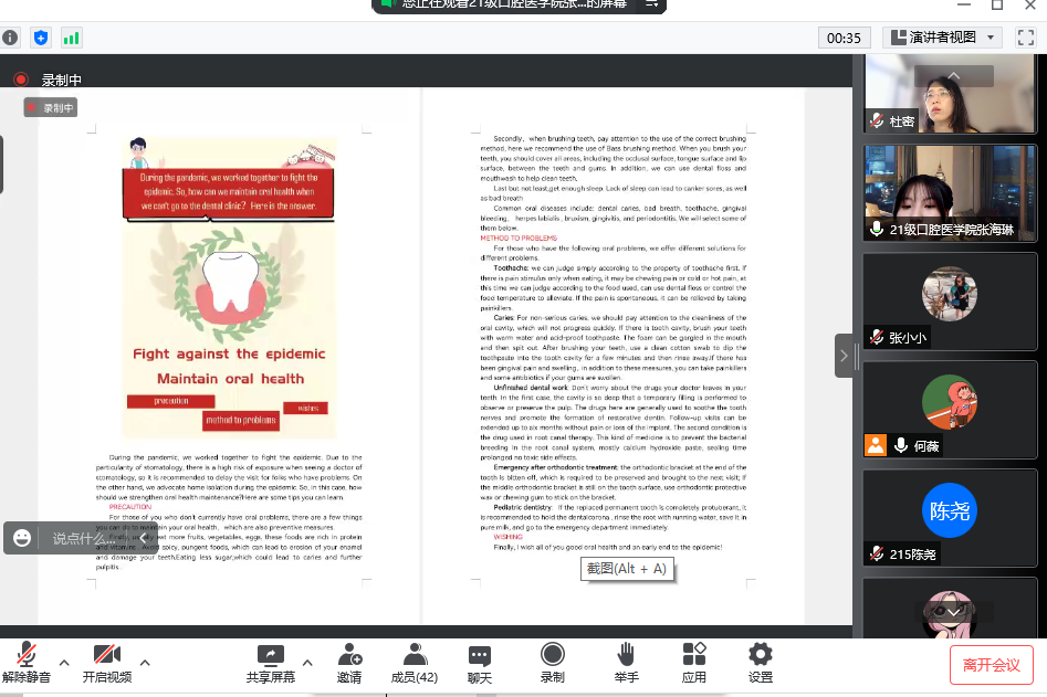 本次大赛主题为“疫情下如何加强口腔健康维护”,设立一、二、三等奖,优秀奖,最佳创意奖,最佳版面设计奖和最佳文字叙述奖五类奖项。来自学院(医院)2021级口腔医学专业的37名本科生进行了壁报展示与全英文讲解。