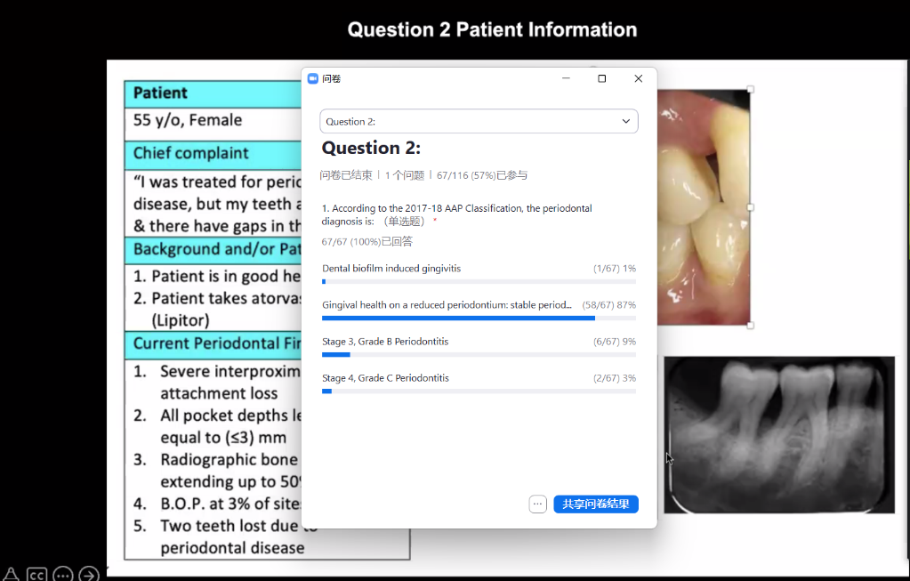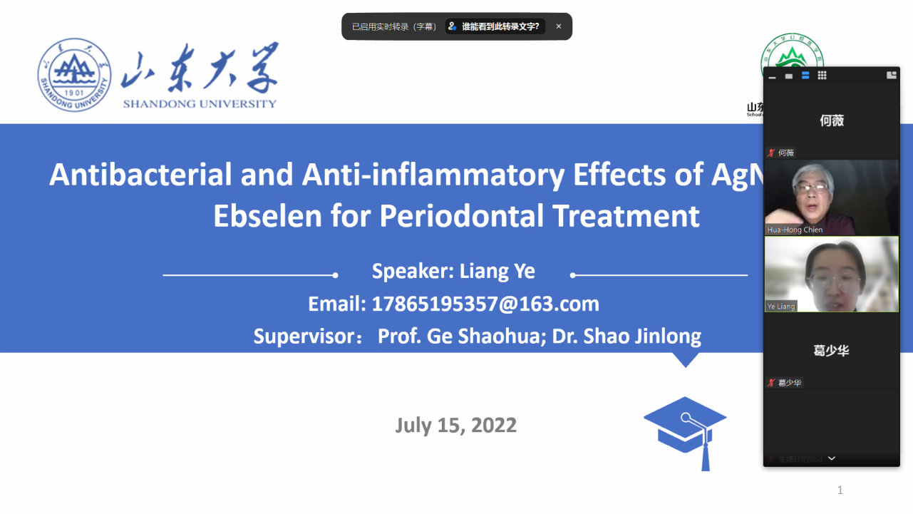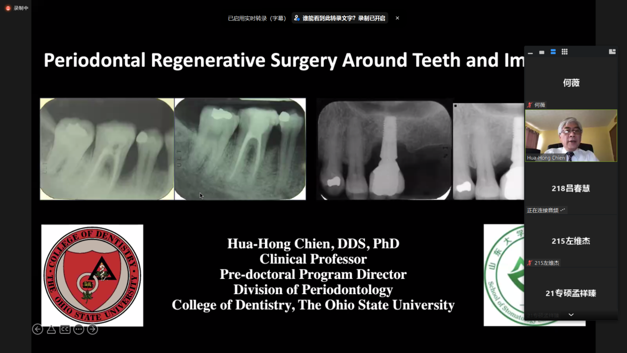 本课程共16学时,Chien教授通过线上教学的形式与学院师生共同探讨了口腔医学临床与科研中的前沿问题。从牙周病和种植体周疾病的分类,到牙周非手术与手术治疗,Chien教授深入浅出地讲解了牙周病学的基本内容和牙周组织再生中的应用,尤其在嵴顶保存术与引导性骨再生作为增加骨量的手段,为种植作预备;利用CAD/CAM手术导板辅助种植体植入,以及机器人动态导航的前景。讲座内容还包括牙周软组织异常的治疗,包括游离龈移植、结缔组织移植、Bruno技术和隧道技术等。此外,还介绍了治疗露龈笑的多种方法,根据牙萌出异常、上唇动度过大等病因针对性进行冠延长术、上唇再定位术治疗。用图片与视频结合的方式展示了多个病例的治疗与预后,通过问卷与同学们积极互动,给予老师和同学们许多学术与临床的启示。讲座中,专业学位硕士研究生王月做了病例汇报,本次报告的主要内容为对一位先天多颗恒牙缺失、乳牙滞留的17岁女性患者,行上颌 3D打印钛网支架骨增量及下颌onlay骨移植,分期种植,下颌角化组织不足处行游离牙龈移植术,完成全口种植修复,最终恢复了患者口颌功能,获得了良好面容改善。专业学位硕士研究生梁晔做了题为《纳米银颗粒与Ebselen联合抗菌抗炎作用研究》的科研汇报,主要涉及抗菌材料纳米银颗粒用于牙周炎抗菌治疗的问题,而与Ebselen联合可发挥协同抗菌作用及减轻纳米银颗粒导致的细胞氧化损伤。汇报后,Chien教授给予了中肯的评价,对病例的治疗和科研的设计给出了关键的指导意见,介绍了最新的前沿理念,博得了全体师生的一致好评。