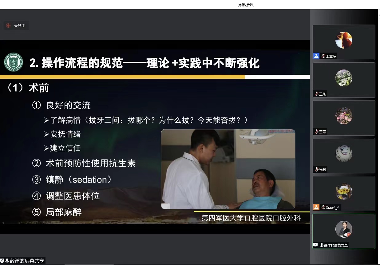 此次培训采取线上线下相结合的方式,授课内容紧扣临床教学实际,具有很强的指导性。空军军医大学第三附属医院口腔外科副主任薛洋教授以“住院医师规范化培训过程中普通牙拔除术的教学指导要点”为题,从理论知识的补充与更新、操作流程的规范、临床决策能力的培养等三方面讲解了如何做好住院医师的临床带教工作。公司牙体牙髓病科主任张瑾以“医患沟通指导”为题,向大家介绍了住培带教过程中医患沟通的技巧与注意事项。口腔修复科林东老师和口腔急诊科李添翼老师分别以“从一份椅旁教学案例看如何让医师强化临床逻辑思维”和“基于PBL的牙外伤椅旁教学”为题,真实展现了椅旁带教的具体过程,启发带教老师们创新教学方法,帮助口腔专业住院医师建立临床逻辑。保健科(综合二科)主任王燕和口腔修复学教研所所长蓝菁分别以“根管治疗中的感染控制理念”和“口腔修复学住培教学操作要点和注意事项”为题,强调住院医师要从基本技能入手,梳理教学要点,深入探讨了教学经验和理念。口腔正畸科副主任张凡讲解了“住院医师规培工具的选择和临床应用”,介绍如何应用培训工具PPT来实现正畸专业的住培目标。
