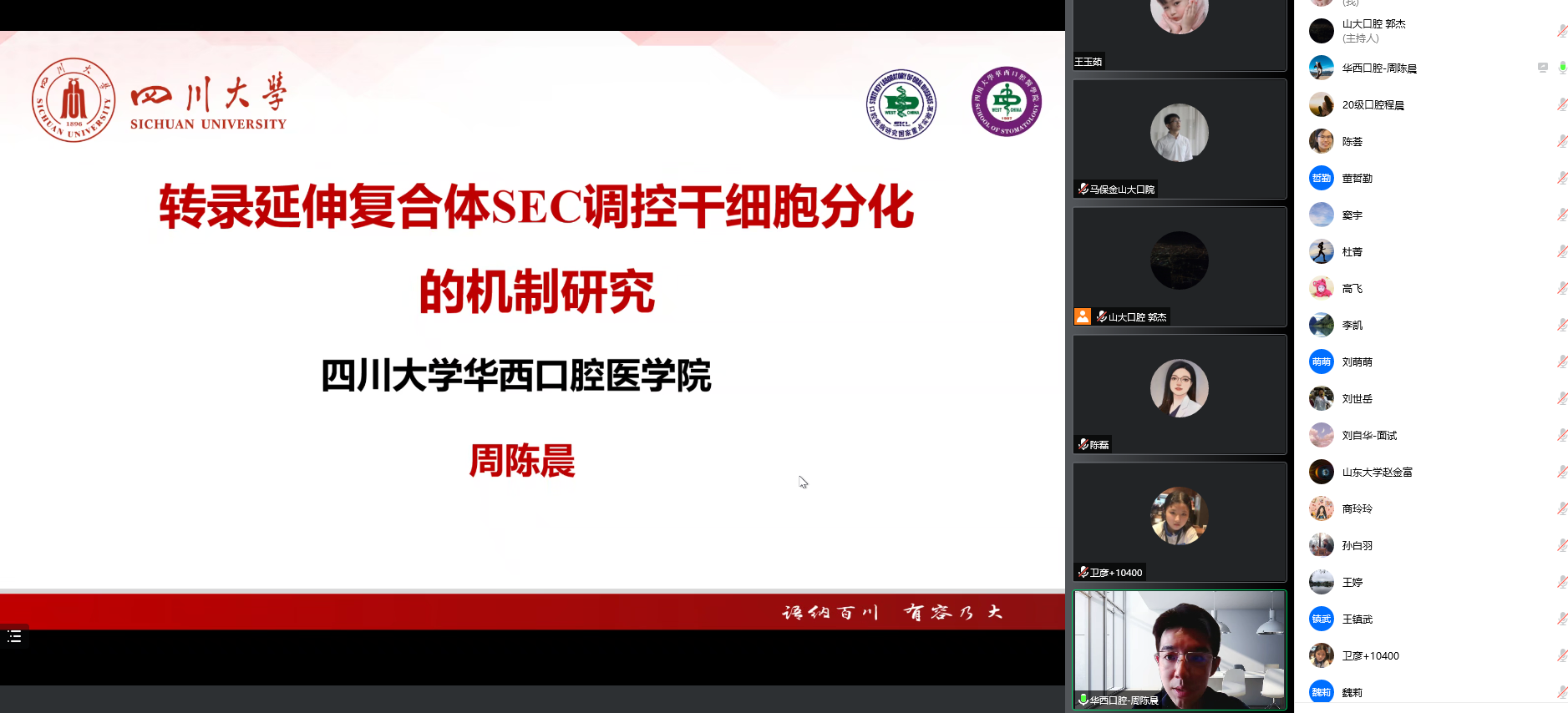 在专家报告中,卫彦、周陈晨、王镇武分别围绕“牙齿仿生修复”、“转录延伸复合体SEC调控干细胞分化的机制研究”和“基于低聚物流体的功能凝胶材料”主题作了精彩演讲。