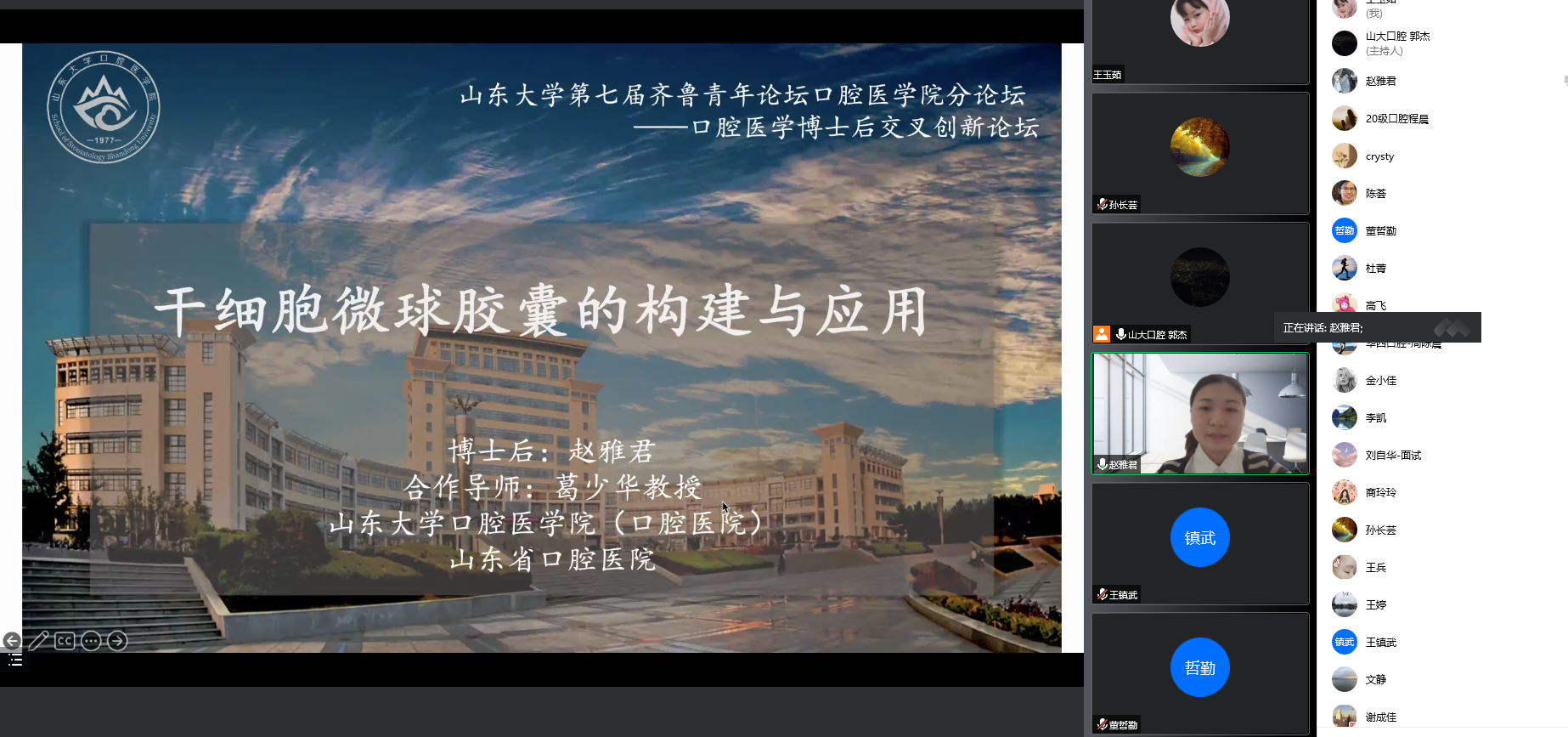 11月11日下午,伟德体育官网第七届齐鲁青年论坛BV伟德官方网站分论坛暨口腔医学博士后交叉创新论坛在BV伟德官方网站(口腔医院)顺利举办。本次论坛以线上形式举行,论坛邀请了国家杰青、北京大学BV伟德官方网站卫彦教授,国家优青、四川大学华西口腔医院儿童口腔科周陈晨副教授,卡尔斯鲁厄理工学院王镇武博士做特邀专家报告,学院(医院)赵雅君博士后与李凯博士后做科研交流分享。会议由学院(医院)副经理郭杰主持,院青年教师、科研人员及博士后参加了本次论坛。