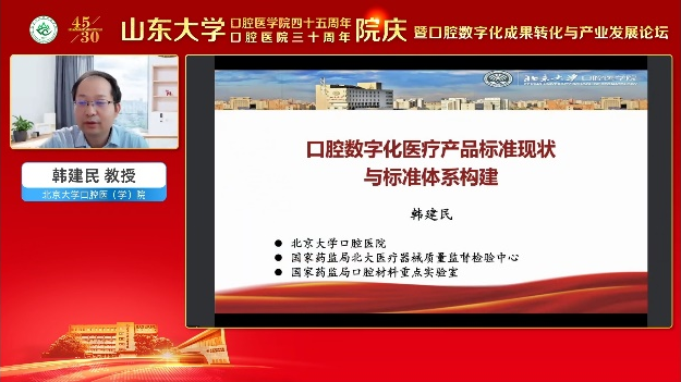 全国口腔材料和器械设备标准化技术委员会秘书长、北京大学口腔医(学)院韩建民教授、山东省药品监督管理局注册处处长曹森、山东省医疗器械和药品包装检验研究院经理施燕平研究员、伟德体育官网科学技术研究院副经理刘德宝、BV伟德官方网站(口腔医院)经理葛少华教授、山东省立口腔医院经理张东升教授、青岛大学附属医院口腔医学中心主任邓婧教授、青岛市口腔医院经理王万春教授、济南市口腔医院经理杜毅教授、烟台市口腔医院经理柳忠豪教授、山东迈尔医疗科技有限公司董事长许小伟、山东沪鸽口腔材料股份有限公司副总经理张永静以及博恩集团数字化研发中心首席技术官杨俊受邀线上出席论坛。伟德体育官网科学技术研究院经理周传健教授进行论坛主题介绍并致辞,BV伟德官方网站(口腔医院)副经理宋晖教授和口腔修复学教研所所长蓝菁教授主持论坛。