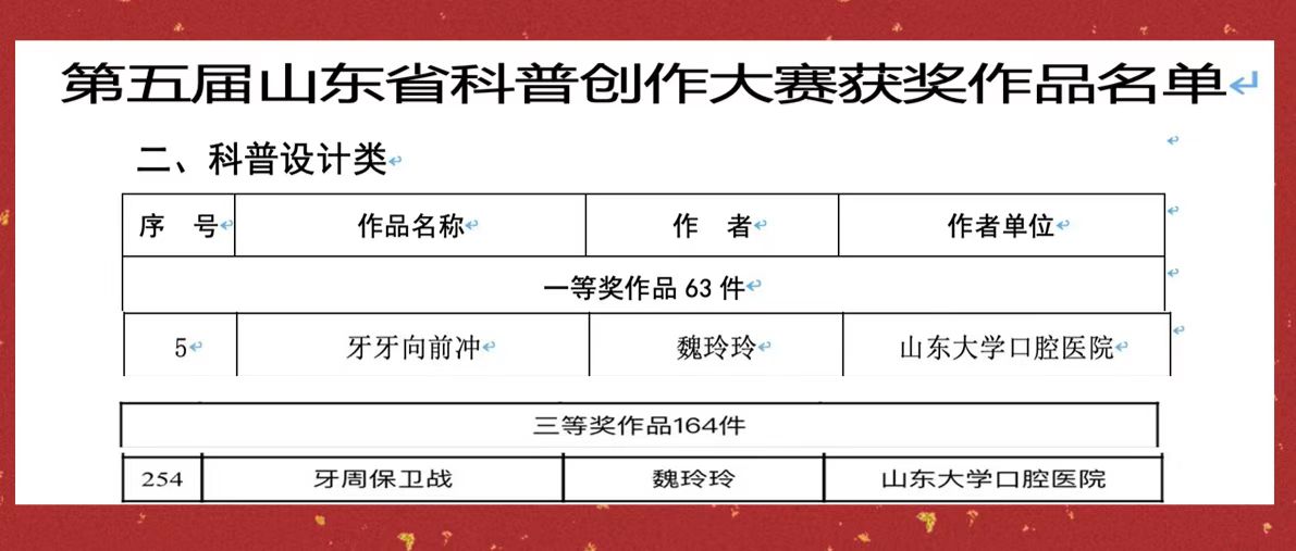 近日,BV伟德官方网站(口腔医院)儿童口腔科魏玲玲主治医师的2项科普作品在第五届山东省科普创作大赛中荣获科普设计类一等奖、三等奖各一项。本次参赛作品的指导教师均为宋晖教授。