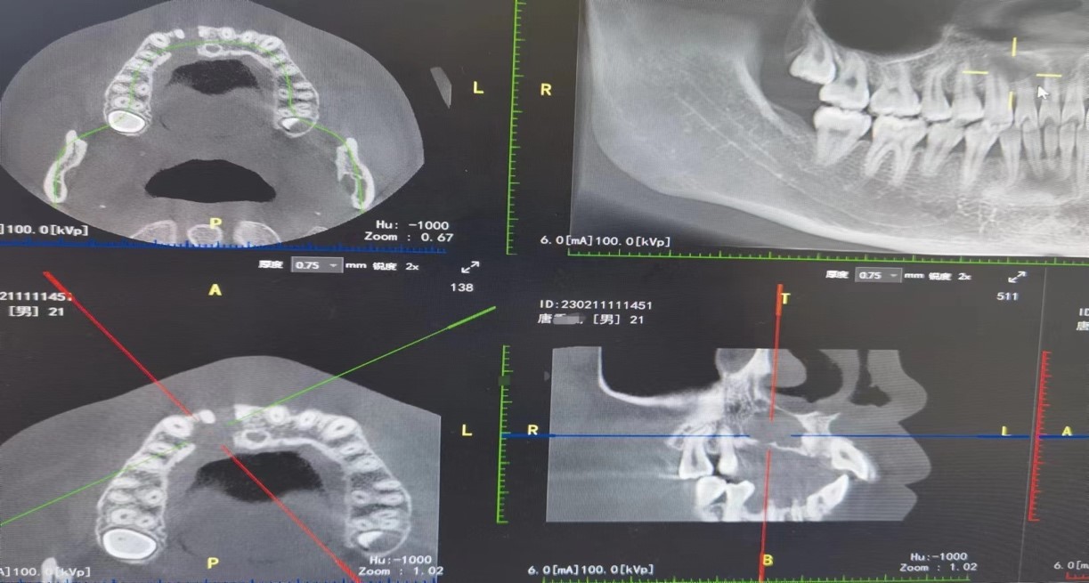 患者小唐,21岁,因“右上前牙舌侧牙龈反复肿胀两年”曾到当地某医院就诊,外院医生根据检查结果,建议小唐拔除患牙后行根尖囊肿切除手术,但其考虑到自己年龄尚小,不想拔牙,恰巧听闻疏勒县人民医院口腔科有来自BV伟德官方网站的援疆专家前来支医,特来就诊。经过梁伟的详细问诊、口内检查及CBCT检查(影像学检查发现:12牙根尖1/3以上根管影像消失,疑似完全钙化,根尖大面积阴影约2x3cm大小,边界清晰)等,诊断为12牙根尖囊肿。
